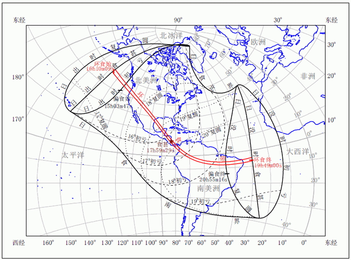 見食地區(qū):這次日食,環(huán)食帶從太平洋東北部開始,經(jīng)過美國、墨西哥、伯利茲、洪都拉斯、尼加拉瓜、巴拿馬、哥倫比亞、巴西,在大西洋西部結(jié)束。在北美洲(除極西部和極東北部)、南美洲(除南部)、太平洋東部、大西洋(除北部和東南部)、非洲極西部可以看到偏食。